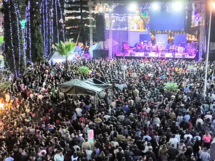 Nogales, Ver.- En la explanada del Palacio Municipal más de 5 mil personas bailaron los éxitos del grupo musical «Los Socios del Ritmo», con motivo de la inauguración de la pista de hielo y la Laguna Iluminada Nogales Veracruz 2022.