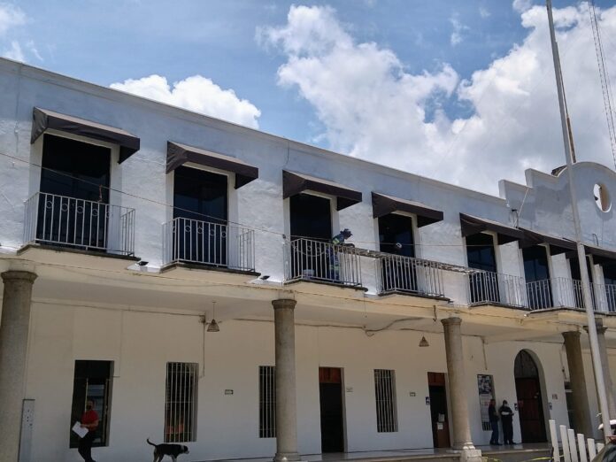 Nogales, Ver.- Por instrucciones del alcalde, Ernesto Torres Navarro, una brigada de trabajadores, repinta el Palacio Municipal previo a los festejos del Grito de Independencia el 15 de septiembre.