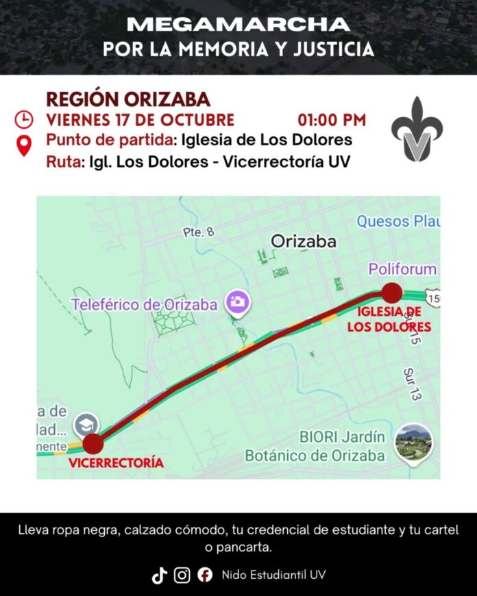 Orizaba, Ver. – En un acto de indignación estudiantes de la Universidad Veracruzana (UV) convocaron a una megamarcha por la justicia y la responsabilidad institucional, tras la tragedia registrada en la zona norte del estado, donde varios jóvenes universitarios perdieron la vida o se encuentran desaparecidos a consecuencia de las recientes inundaciones.La movilización se realizará el próximo viernes 17 de octubre a la 1:00 de la tarde, con punto de partida en la Iglesia de Los Dolores y destino final en la Vicerrectoría de la UV, ubicada en los límites entre Orizaba y Río Blanco, solicitando a los participantes vestir ropa negra, portar credencial universitaria, calzado cómodo y pancartas alusivas a las demandas del movimiento. “Lo ocurrido en la zona norte no fue un accidente; fue consecuencia directa de la negligencia del Estado y de la Universidad Veracruzana”, señalaron los estudiantes en un comunicado público.Los universitarios aseguran que los pronósticos meteorológicos y las advertencias sobre riesgo de inundaciones eran conocidos con una semana de anticipación, pero las autoridades educativas decidieron no suspender clases sino hasta cuando la emergencia ya se encontraba fuera de control. “Mientras el agua subía, ellos dormían. Hoy hay estudiantes muertos, desaparecidos y comunidades devastadas. Y las autoridades sólo emiten comunicados para deslindarse. No lo vamos a permitir”, expresaron.Durante el recorrido por la avenida principal los jóvenes exigirán la destitución de funcionarios universitarios y estatales a quienes responsabilizan por omisión y falta de respuesta oportuna.La consigna central será “¡Exigimos respuestas y justicia!”, con el llamado a mantener la manifestación de forma pacífica y organizada, en defensa de los derechos y la memoria de sus compañeros. “Queremos responsabilidades, no discursos vacíos”, puntualiza el mensaje de los convocantes.