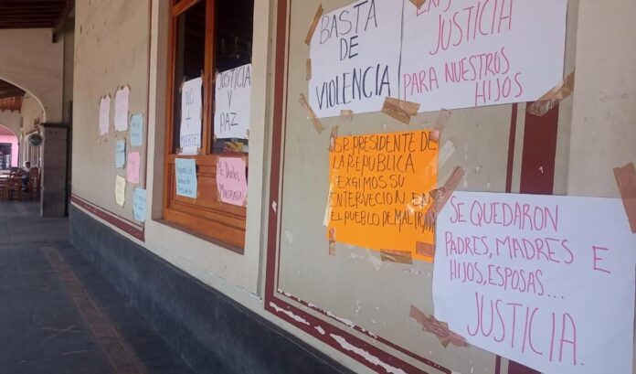 Los inconformes colocaron carteles en los muros de este lugar con exigencia de justicia: “Justicia para los 3”; “Justicia para ellos”; “Ni uno más, exigimos seguridad”; “Velemos juntos por la paz de nuestro pueblo; Fuera autoridades corruptas, Sindica (Sara Ivette Jacinto Vega) y Margarito (Ramírez Brenis, alcalde); Justicia para Aarón Juárez, David Romero y Emanuel Fabián”.
