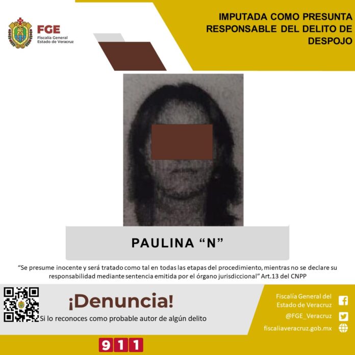 Boca del Río, Ver.- La Fiscalía Regional Veracruz realizó imputación en contra de Paulina “N” como presunta responsable del delito de despojo. El Juez dictó como medida cautelar presentación periódica los viernes de cada mes, dentro del Proceso Penal 316/2022.