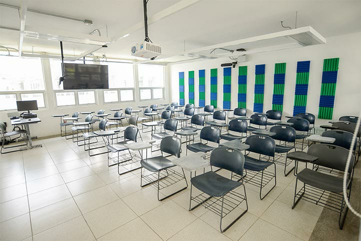 El aula híbrida posibilita las clases de forma presencial y remota de manera simultánea; para ello, cada una de estas aulas cuentan con sus propios recursos tecnológicos: proyector, centro de mando, computadoras, televisión, sistema de audio y sistema de video.