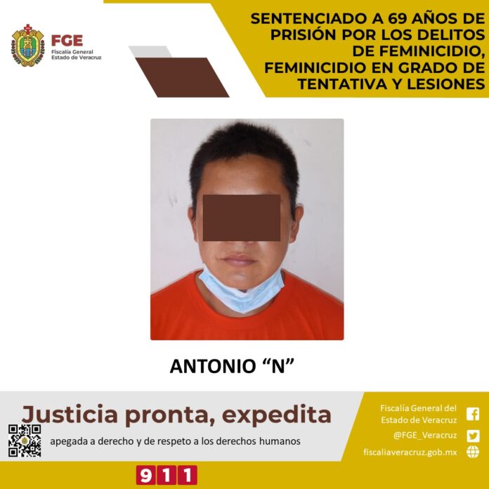 Misantla, Ver.- La Fiscalía Especializada en Investigación de Delitos de Violencia contra la Familia, Mujeres, Niñas y Niños y de Trata de Personas logró sentencia condenatoria de 69 años de prisión: 40 años por el delito de feminicidio, 26 por feminicidio en grado de tentativa y 3 años por lesiones en contra de Antonio “N” quien privó de la vida a la víctima quien en vida se identificaba con las iniciales S. D. C., y en agravio de 2 víctimas con identidad resguardada, los hechos acontecieron el 9 de junio del 2019, dentro del Juicio 15/2022.