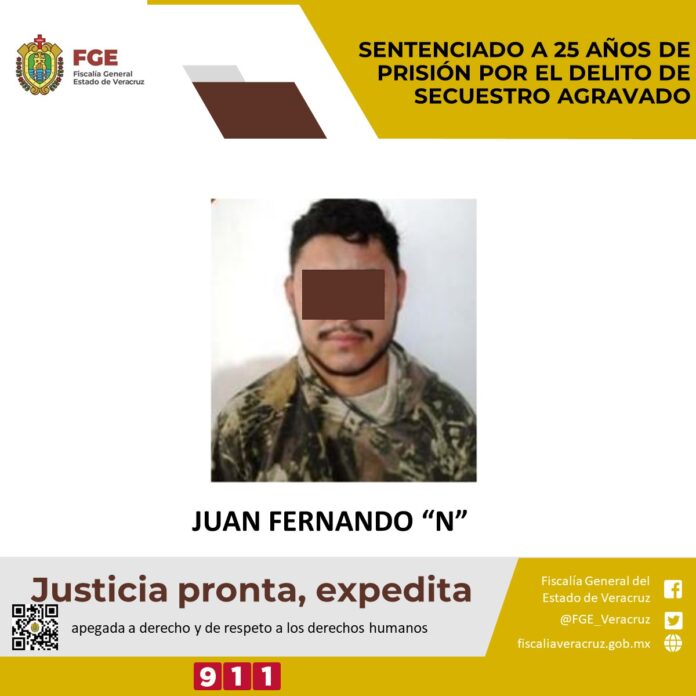 Tantoyuca, Ver.- La Unidad Especializada en Combate al Secuestro logró sentencia condenatoria de 25 años de prisión en contra de Juan Fernando “N” por el delito de secuestro agravado cometido en agravio de la víctima con identidad resguardada, dentro del proceso penal 31/2020.