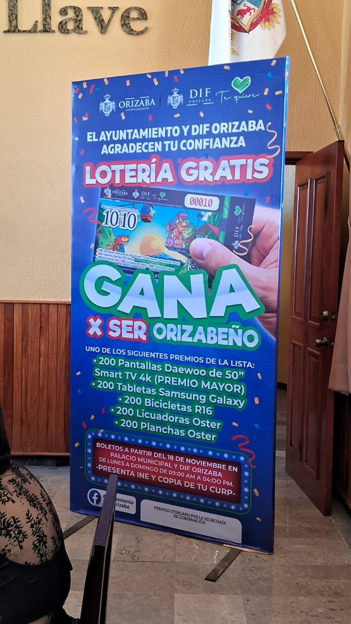 Orizaba, Ver.- Con una inversión por alrededor de 2 millones y medio de pesos, el Ayuntamiento de Orizaba presentó este miércoles el sorteo «Gana x ser orizabeño» en donde entregarán mil premios durante el la “Lotería” realizada 01 de enero de 2025 a las 00:30 horas en Polifórum Mier y Pesado, posterior a la celebración de Año Nuevo.