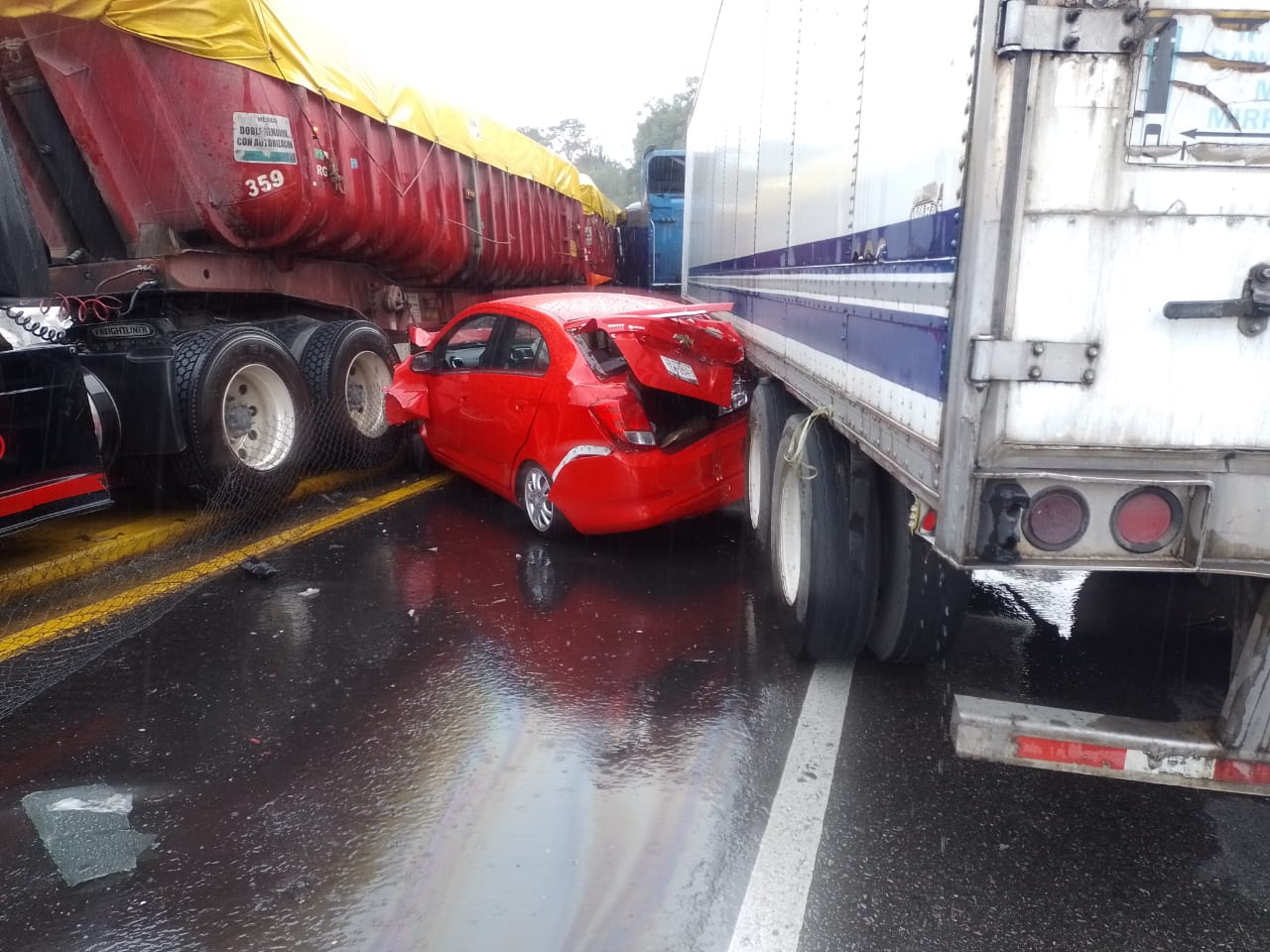 Al pasar el Puente de Metlac por el torrencial aguacero que caía en esos momentos patinó y perdió el control. Luego de invadir el carril contrario chocó frontalmente contra otro tráiler con doble remolque.