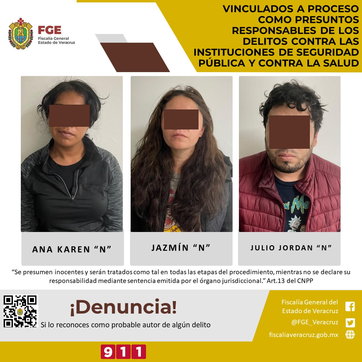 Nogales, Ver.- La Fiscalía Regional de la zona centro-Córdoba obtuvo vinculación a proceso en contra de Ana Karen “N”, Jazmín “N” y Julio Jordan “N” como presuntos responsables de los delitos contra las instituciones de seguridad pública y contra la salud.